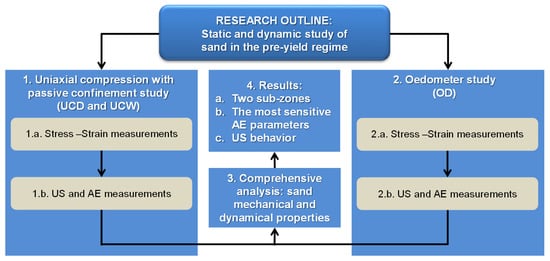 Block diagram presenting the research outline. The key objective of this research was the comprehensive experimental study of the mechanical and dynamical properties of sand in the pre-yield regime by means of combined acoustic emission (AE) and ultrasound (US) analysis.