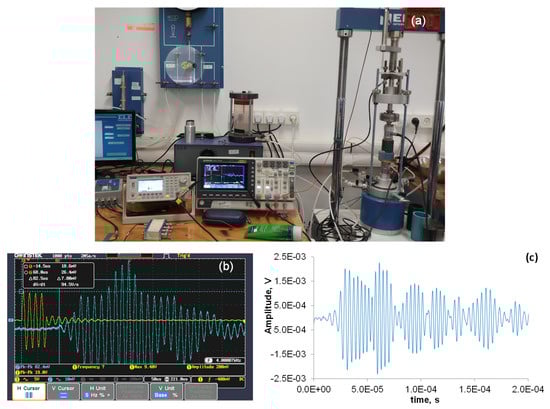 (a) Indicative snapshot during one of the modified uniaxial tests with passive confinement. (b) Indicative screenshot of the US signals measured by the digital oscilloscope. (c) Indicative AE signal acquired during the experiments. Note that in the used number format, the notation “E±xx” is part of a scientific notation and corresponds to “”.