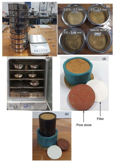 Dune sand from the Ashdod beach (southern Israel) was selected for the experiments. Grain distribution analysis showed that the sand could be categorized as sand, poorly graded (SP), based on the Unified Soil Classification System (USCS). The experiments were carried out using four types of samples as follows: natural dune sand and its three extracted fractions (2.36–0.6, 0.6–0.3 and 0.3–0.075 mm (Figure 5a,b)). Note that the selected grain size was significantly wider than in the majority of other investigations that mainly used a very thin range of grain sizes ([22] and references therein). Prior to sample preparation, all types of sand were dried for 24 h in an oven at 105 °C (Figure 5c). After the sand samples were dried, they were placed in the OD and UCD or UCW loading cells (Figure 5d,e, respectively). The average beginning value of the density for all dry samples was 1.67 ± 0.03 gr/cm3, while for wet samples it was 1.79 ± 0.03 gr/cm3. The value of the mass moisture content in the UCW tests was experimentally selected to be 5%, which was the maximum moisture content that could be absorbed by the sandy material but not squeezed out during sample preparation. The values of the mass moisture content were checked by the standard method of moisture content observation [35]. In addition, the open porosity of the soil samples can be calculated as follows: