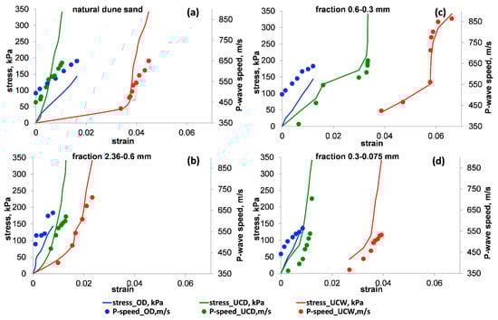 The stress–strain relationships (solid curves) vs. the values of the US P wave speed (full circles) for the OD (blue), UCD (green) and UCW (red) tests. Panels (a–d) show the results for natural dune sand and its three extracted fractions as follows: 2.36–0.6, 0.6–0.3 and 0.3–0.075 mm, respectively.