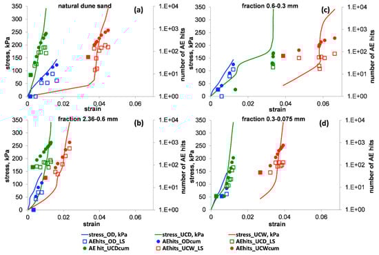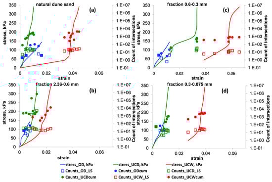 The stress–strain relationships (solid curves) vs. the values of the counts for the OD (blue), UCD (green) and UCW (red) tests. The empty squares and the full circles denote the values of average (index = LS) and cumulative (index = cum) counts for a load stage, respectively. Panels (a–d) show the results for natural dune sand and its three extracted fractions: 2.36–0.6, 0.6–0.3 and 0.3–0.075 mm, respectively. Note that in the used number format, the notation “E±xx” is part of a scientific notation and corresponds to “”.