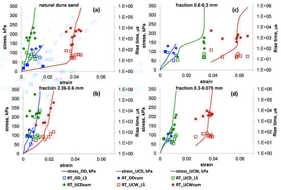The stress–strain relationships (solid curves) vs. the values of the rise time (RT) for the OD (blue), UCD (green) and UCW (red) tests. The empty squares and the full circles denote the values of average (index = LS) and cumulative (index = cum) RTs for a loading stage, respectively. Panels (a–d) present the results for natural dune sand and its three extracted fractions: 2.36–0.6, 0.6–0.3 and 0.3–0.075 mm, respectively. Note that in the used number format, the notation “E±xx” is part of a scientific notation and corresponds to “”.