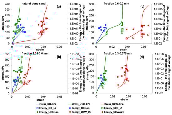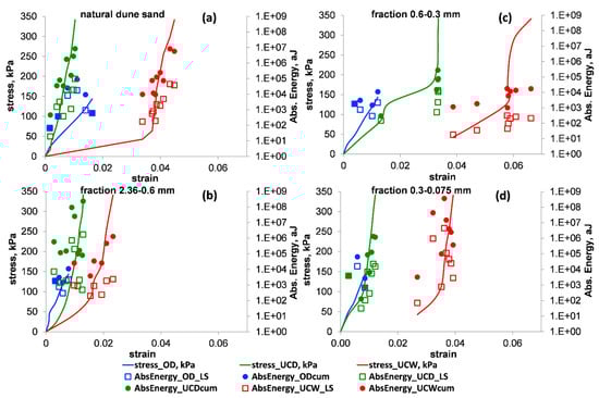 The stress–strain relationships (solid curves) vs. the values of the absolute energy (AbsEnergy) for the OD (blue), UCD (green) and UCW (red) tests. The empty squares and the full circles denote the values of the average (index = LS) and cumulative (index = cum) AbsEnergy for a loading stage, respectively. Panels (a–d) show the results for natural dune sand and its three extracted fractions: 2.36–0.6, 0.6–0.3 and 0.3–0.075 mm, respectively. Note that in the used number format, the notation “E±xx” is part of a scientific notation and corresponds to “”.