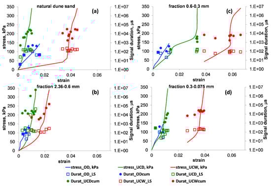 The stress–strain relationships (solid curves) vs. the values of the signal duration (Durat) for the OD (blue), UCD (green) and UCW (red) tests. The empty squares and the full circles denote the values of the average (index = LS) and cumulative (index = cum) signal durations for a loading stage, respectively. Panels (a–d) present the results for natural dune sand and its three extracted fractions: 2.36–0.6, 0.6–0.3 and 0.3–0.075 mm, respectively. Note that in the used number format, the notation “E±xx” is part of a scientific notation and corresponds to “”.