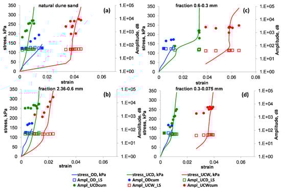 The stress–strain relationships (solid curves) vs. the values of the signal amplitude (Ampl) for the OD (blue), UCD (green) and UCW (red) tests. The empty squares and the full circles denote the values of the average (index = LS) and cumulative (index = cum) signal amplitudes for a loading stage, respectively. Panels (a–d) show the results for natural dune sand and its three extracted fractions: 2.36–0.6, 0.6–0.3 and 0.3–0.075 mm, respectively. Note that in the used number format, the notation “E±xx” is part of a scientific notation and corresponds to “”.