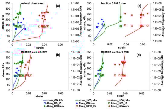 The stress–strain relationships (solid curves) vs. the values of the signal average frequency (Afreq) for the OD (blue), UCD (green) and UCW (red) tests. The empty squares and the full circles denote the values of the average (index = LS) and cumulative (index = cum) signal average frequencies for a load stage, respectively. Panels (a–d) illustrate the results for natural dune sand and its three extracted fractions: 2.36–0.6, 0.6–0.3 and 0.3–0.075 mm, respectively. Note that in the used number format, the notation “E±xx” is part of a scientific notation and corresponds to “”.