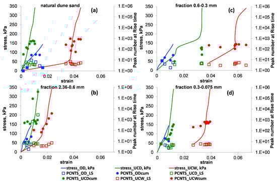 The stress–strain relationships (solid curves) vs. the values of the peak number (PCNTS) for the OD (blue), UCD (green) and UCW (red) tests. The empty squares and the full circles denote the values of the average (index = LS) and cumulative (index = cum) PCNTS for a load stage, respectively. Panels (a–d) present the results for natural dune sand and its three extracted fractions: 2.36–0.6, 0.6–0.3 and 0.3–0.075 mm, respectively. Note that in the used number format, the notation “E±xx” is part of a scientific notation and corresponds to “”.