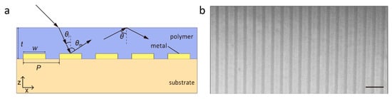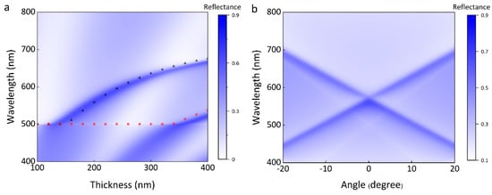 (a) The resonance behavior as a function of the thickness. P = 500 nm and the refractive index n is fixed to 1.5. Black triangles (q = 1) and red squares (q = 2) are analytical results from Equation (3). In the equation, mode orders were chosen as q = 1 and q = 2, and the corresponding diffraction order m = 3 and m = 1. (b) Resonant wavelength as a function of the incident angle . t = 200 nm. Other parameters are the same as (a).