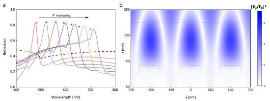 (a) The simulated reflection spectra for the grating period P from 400 nm to 700 nm with a step size of 50 nm. For the waveguide coating, the refractive index n is fixed to 1.5, and the thickness t is set at 200 nm. The dashed line represents the reflection spectrum of the grating array (P = 500 nm) without waveguide coating. The asterisks are the analytical resonance wavelengths calculated by Equation (3). The analytical parameters are the same as numerical ones except for for simplicity. (b) The electrical field intensity profile at XZ plane for the guided mode resonance at 564 nm. P = 500 nm, t = 200 nm.