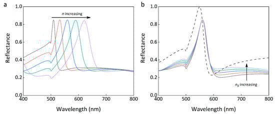 Refractive index contrast can have a dramatic effect on the guided mode. In Figure 3, we show how the guided mode resonance varies as a function of the refractive index of waveguide and substrate. Figure 3a displays that the resonance peak redshifts as the refractive index of the waveguide increases. This can be explained by Fresnel’s equation although is not intuitive from Equation (3). The phase shift of is a function of the refractive index of the cladding layer and the waveguide layer. Increasing the index contrast can increase the phase shift at the boundary and hence causes a redshift of the resonance wavelength. In Figure 3b, as expected, no resonance shifts as the refractive index of the substrate changes. This implies that the metal grating diffraction effect can substitute for the TIR to couple and excite guided mode resonance in a waveguide layer. All the resonance peaks are not at unity due to the reflection loss of the metal. If we replace Al with a PEC in the simulation, the resonance peak can reach unity (shown in Figure 3b).