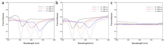 (a) The measured (solid line) and simulated (dash line) transmittance spectra with various periods (P = 400 nm, P = 500 nm, and P = 600 nm) with SU8 as the waveguide layer for TE polarization. The thickness of SU8 t = 205 nm. (b) The measured (solid line) and simulated (dash line) transmittance spectra with various periods (P = 400 nm, P = 500 nm and P = 600 nm) with SU8 as the waveguide layer for TE polarization. The thickness of SU8 t = 172 nm. (c) The measured (solid line) and simulated (dash line) transmittance with various periods (P = 400 nm, P = 500 nm and P = 600 nm) with no SU8 for TE polarization. In all simulations, the duty cycle is set as 0.4. and n = 1.6. t is set as 200 nm and 170 nm.