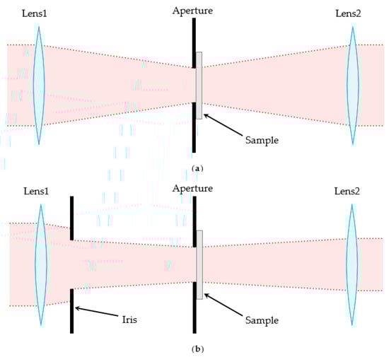 It is possible to reduce this distortion by restricting the source light via an aperture placed some distance in front of the sample. While this will not collimate the incident illumination, it will limit the angular variation such that Equation (8) becomes a good approximation of the transmittance values. An illustration of this modification is included in Figure 2. While it is unavoidable that restricting the source illumination in this manner will reduce the system throughput, it is possible to balance the reduction of output power with the increased signal-to-noise ratio [29]. It will also be necessary to collect all background scans with the aperture installed such that it matches the restriction used during the actual material scans.