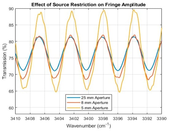Additionally, restricting the source beam spread serves to increase the interference fringe amplitudes. A significant consequence of the unrestricted beam spread in typical FTIR spectral analysis is that fringes at higher frequencies are suppressed; this modification reduces that effect [28]. Figure 3 shows a direct comparison of interference fringes collected using three different aperture sizes to restrict the source beam and illustrates its effect on fringe amplitudes. Apertures were mounted within each FTIR spectrometer to limit the angle of incidence to less than ±3.0° from normal. Specific aperture configurations for each FTIR spectrometer are summarized in Table 2.