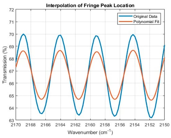 While a scan resolution of 0.25 cm−1 is sufficient to capture the fringe waveforms, for the purpose of calculating the refractive index, the fringe peak positions must be known more precisely. To that end, the transmission spectra were mathematically characterized with a polynomial fit to more precisely interpolate the location of the fringe peaks. Peak locations measured using this method were expected to have an accuracy of at least two decimal places (0.01 cm−1 → 0.0001 m−1), supporting an index of refraction calculation out to four decimal places. An example of the fringe peak fitting is depicted in Figure 5.