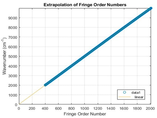 Once the fringe positions have been measured using the polynomial fit method, it is still necessary to assign absolute fringe order numbers. The absolute fringe order for each peak is extrapolated via a linear fit to the zeroth-order. Fringe peak spacing in the frequency domain is nearly linear such that plotting the relative fringe order numbers against the fringe frequency position allows for an accurate determination of the offset from zero (i.e., 0 cm−1). This extrapolation process is depicted in Figure 6.
