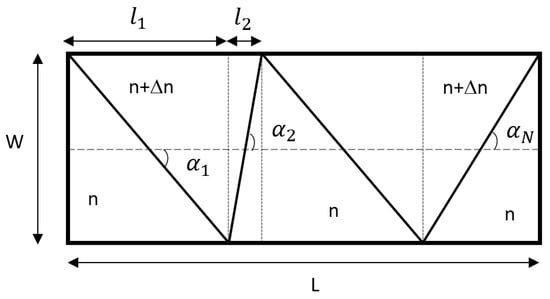 In addition to the index change, the deflection angle of an EO steerer depends on the effective length-to-width ratio of the EO crystal [1,2,13,14,24,26]. Since long single EO crystals are usually not available, the crystals’ effective width is reduced to increase the deflection angle in some studies. McManamon and Ataei suggested cutting the EO crystal like a fishtail [11]. Fang et al. suggested a trapezoid-shaped and horn-shaped crystal to maximize the effective length-to-width ratio and maximize the deflection angle [24]. However, cutting and machining the EO crystal increases the cost of the EO beam steerer. Therefore, if a long EO medium were available, the optimum shape would be a long rectangular shape.