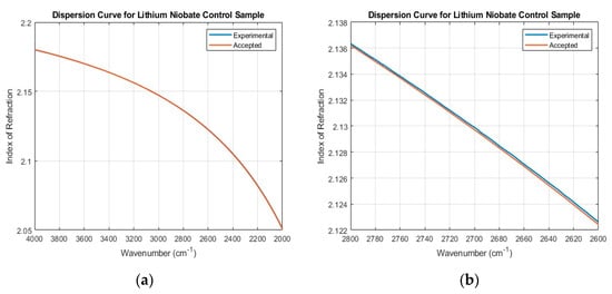 Figure 15. A comparison of the calculated refractive index values to literature values for the lithium niobate control sample. (a) full-view; (b) zoomed-view to show differences.