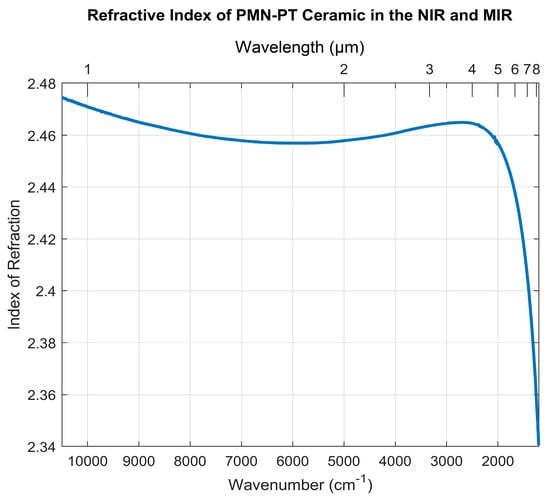 To design and model an EO beam steerer based on polycrystalline PMN-PT and determine the ceramic’s EO coefficient at several wavelengths and temperatures by measuring and/or simulating the deflection angle, the refractive index, transmission, and dielectric constant of this ceramic should be known. The refractive index was determined using FTIR spectroscopy [27,28,29]. The transmission was determined from Fresnel equations and compared with the data measured in the lab. The dielectric constant was found as a function of temperature through a capacitance bridge analysis (CBA).