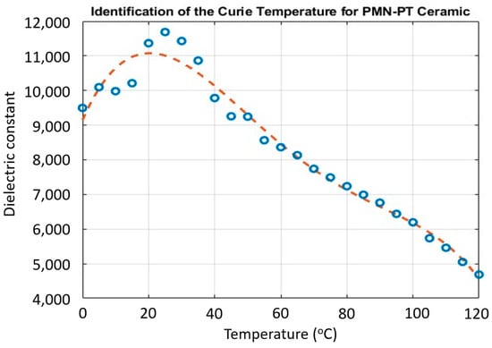 For the calculations of the dielectric constant, a thin unpolished sample of PMN-PT (approximately 12 mm × 10 mm × 0.5 mm) was characterized using a capacitance bridge apparatus. Capacitance values of the PMN-PT sample at multiple temperatures were compared to “open-cell” capacitance to determine the dielectric constant as a function of temperature.