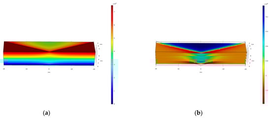 Figure 20. (a) Voltage (b) electric field (Ez) simulation of the EO steerer based on PMN-PT ceramic under 1 kV/mm at 25 °C using a COMSOL model.
