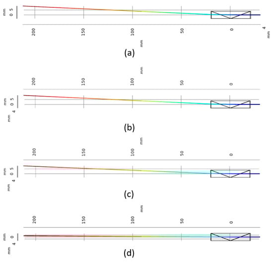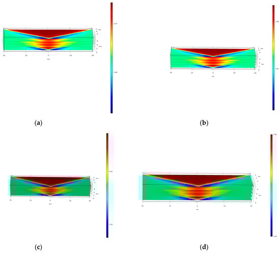 Figure 22. The deflection angle simulation of the EO steerer based on PMN-PT ceramic under 1 kV/mm at 25 °C using a COMSOL model for (a) 532 nm, (b) 633 nm, (c) 1550 nm, and (d) 4500 nm.