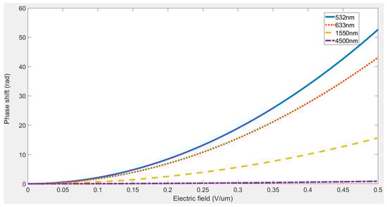 Figure 23. The phase retardance versus applied electric field on PMN-PT ceramic for four wavelengths (532, 633, 1550, and 4500 nm).