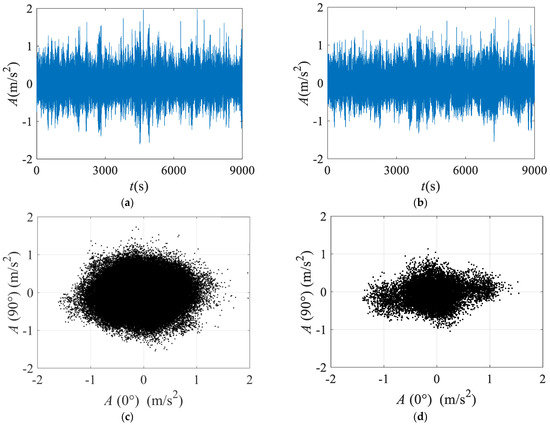 The entire process, to investigate the variability of magnitudes such as singular values or eigenvectors, was subdivided into fifteen 10 min long recording sessions [24,25,26,27,28,29]. Figure 2 shows two examples of processes with U = 49.0 m/s, along and across wind, subdivided in sub-processes. The along versus across wind acceleration point cloud graph shown in Figure 3 shows that the difference between sub-processes (in the 10 min records) is relevant because it changes significantly as for example with T [0; 9000] (Figure 3c), T [2400; 3000] (Figure 3d), T [7200; 7800] (Figure 3e) and T [840; 9000] (Figure 3f) [24,25,26,27,28,29].