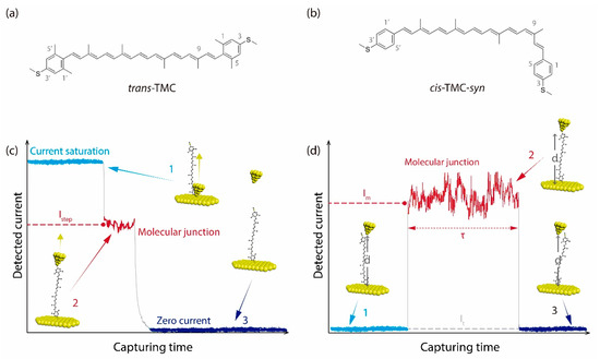 (a) Trans-TMC (terminal 1,5-dimethyl-3-methylthiophenyl) and (b) cis-TMC-syn synthesized molecules. (c) Schematic of the dynamic BJ approach: (1) current saturation; tip and substrate in contact, (2) current plateau at Istep due to the formation of a molecular junction during tip retraction, (3) zero current (junction breakdown) stage when the tip is pulled away from the surface and the molecule detaches from one electrode. (d) Schematic of the blinking approach: (1) fixed inter-electrode distance, d, at a pre-defined tunnelling current, It. (2) current blink at, Im due to the spontaneous formation of a molecular junction (with a finite lifetime τ), (3) current drop to It upon spontaneous molecular junction breakdown.