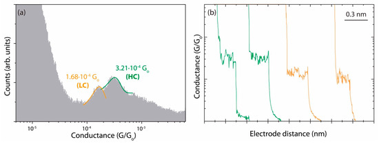 The 1D semi-logarithmic conductance histogram retrieved from single-molecule dynamic BJ experiments in the trans-TMC molecules exhibits two broad, overlapping conductance features (Figure 2);1.68 × 10−4 Go (low conductance regime, LC) and 3.21 × 10−4 Go (high conductance regime, HC), where Go = 2e2/h = 77.47 μS, the h Planck constant, the e elementary charge. The HC value is roughly twice of the LC value which might suggest the formation of multiple trans-TMC molecular junctions. However, several experimental observations rule out previous scenario: first, all the collected current traces show no correlation, displaying either HC or LC plateaus (Figure 2b), as opposed to current traces of junctions formed by multiple molecules that are characterized by the appearance of sequential plateau features due to consecutive molecular disconnections [47]. Second, junctions formed by multiple molecules also have a characteristic formation yield that decreases with the number of trapped molecules, i.e., the frequency of molecular junction formation decreases from the low conductive (few molecules) to the high conductive junctions (many molecules) [47,48]. The latter is the behaviour opposite to that observed in Figure 2a where the HC yield (27.7%) is significantly higher than the LC yield (17.4%). As such, we rule out that the HC values are related to a multiple molecule junction scenario and that the detection of the two current signatures must be a consequence of distinct single-molecule properties as discussed below.