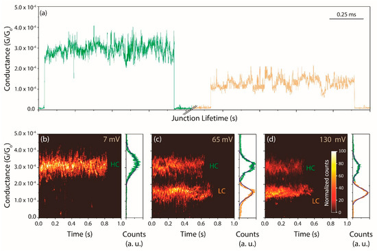 (a) Representative HC (green) and LC (orange) blinks of the trans-TMC junction formation in a typical static BJ experiment. 2D conductance maps built out of hundreds of trans-TMC blinking traces at Vbias = (b) 7 mV, (c) 65 mV, and (d) 130 mV at a fixed gap distance. Counts are normalized to a maximum of 100.