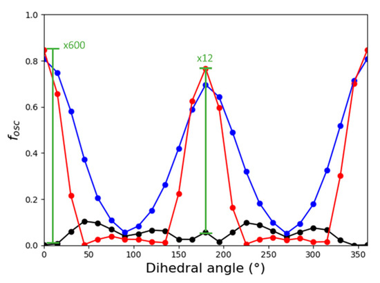 Oscillator strength for the S0 → S1 transition. Black, blue, and red colours correspond to external electric fields (EEF) = 0, +2.3 × 10−4 a.u. and −2.3 × 10−4 a.u., respectively. Note the strength difference in the enhancement of the oscillator between trans-TMC and cis-TMC conformers (a factor of 12 and 600, respectively).