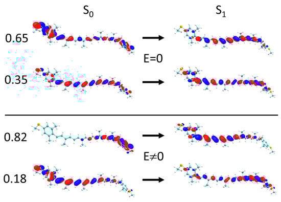 Natural transition orbitals [64] for the S0 → S1 transition of the cis-TMC in the absence (top) or presence (bottom) of an EEF (180° dihedral angle). The weight of each contribution is indicated at the left side.