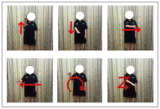 Five users performed predesigned gestures. As shown in Figure 3, the predesigned gestures were of six types: upward, downward, leftward, rightward, circle, and zigzag, which are commonly used in the field of human–computer interaction. When collecting the data, the user stood on the premarked location and faced the computer screen. Before data collection, the screen showed the type of gesture and reminded the user to raise their hand to prepare for the action. After 3 s of preparation time, the user started performing the gesture, and the duration time of each gesture was 1.8 s. At the same time, the computer started collecting CSI data frames with a sampling rate of 1000 data frames/s, and each CSI datum had four labels: the identity of the users, the room number, the location number, and the gesture category. Afterward, the screen showed instructions to stop for 2 s, and the user took a short break. Thus, the CSI data collection of one gesture was completed. We kept repeating the above process until the data collection was completed.