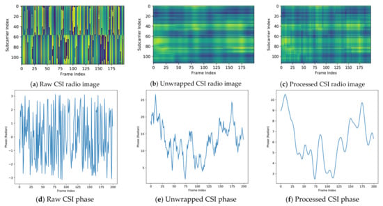 Before feeding the raw CSI data into the proposed WiGR model, we needed to remove noises to improve gesture recognition accuracy. As we know, pulse and burst noise are usually at a higher frequency than the reflected signal caused by human movement, whereas static reflectors usually have a lower interference frequency [42,43]. Therefore, it is necessary to filter this interference noise. In our experiments, we adopted a finite impulse response (FIR) filter [44] designed by the least-squares method, with the cutoff frequencies set to 2 and 80 Hz. Figure 4 shows the CSI phase waveform of the “upward” gesture in 200 data frames and its corresponding CSI radio image. As shown in Figure 4a–c, the CSI radio images have both spatial and temporal characteristics that are useful for recognition. The x-axis represents the duration of one CSI datum collection, which shows the temporal characteristics of the CSI data. The y-axis represents 114 subcarriers, which shows the spatial change of the CSI data. For the sake of clarity, we randomly selected one subcarrier of the CSI data to show its phase waveform in Figure 4d–f. In addition, the sampling clock and carrier frequency of the Tx and Rx were not synchronized in the real-world Wi-Fi systems, and this led to sampling time offset and sampling frequency offset, which introduce random phase shift. Therefore, the raw CSI phases were wrapped in the range of [−π, π], as shown in Figure 4d, which wrongly shows the changing trend of CSI phases. We unwrapped the CSI phases to recover the lost information by removing random phase shifts [10], as shown in Figure 4e. Unwrapped CSI phases were then filtered with an FIR filter to remove noise interference, as shown in Figure 4f.