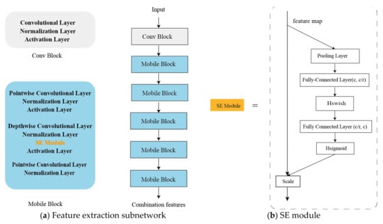 An illustration of the structure of the feature extraction subnetwork (a) and the SE (Squeeze and Excitation) module (b). The feature extraction subnetwork consists of a conv block and a mobile block.