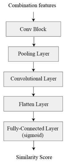 Similarity discrimination subnetwork. Similar to the feature extraction subnetwork, we also adopted a CNN structure to construct the similarity discrimination subnetwork. As shown in Figure 6, we utilized a conv block to further analyze the representational information of the combination features obtained from the feature extraction subnetwork. We used an average pooling layer made up of a 3 × 3 kernel to reduce the number of parameters. The following layer is a convolutional layer used to further extract features. A flatten layer was used to condense multidimensional features into one dimension, and it is usually used in the transition from a convolutional layer to a fully connected layer. The fully connected layer mapped the learned distributed feature representation to the sample labeling space with a sigmoid as an activation function and output the similarity score of gestures in the range of 0 to 1. A large score means that the combined features belong to the same type of gestures. Thus, the similarity discrimination subnetwork could determine the relationship of samples accurately. Table 4 shows the specifications for the similarity discrimination subnetwork.