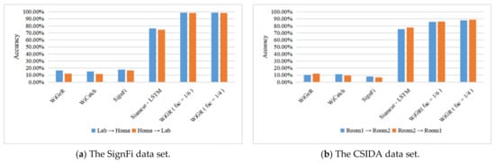 - Cross-environment evaluation. For the environmental shift, we used CSI data from two different environments. All the data from one environment were used for training, while data from the other environment were used for testing. Figure 7 shows the accuracy for recognizing gestures that are collected in a new environment with three support samples for each gesture, where A → B denotes that A is the training set and B is the testing set. We can see that traditional machine learning methods, such as WiGeR and WiCatch, and an ordinary convolutional network, such as SignFi, have almost no shift ability when testing samples from a totally new environment, while our proposed WiGR model could achieve an average accuracy of 98% and 88% using the SignFi and CSIDA data sets, respectively, and therefore remarkably outperforms the other methods.