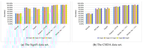 - Cross-user evaluation. For the user shift, we evaluated all methods in the same environment to control variables, and then conducted leave-one-user-out cross-validation using CSI traces from different users. In other words, we adopted CSI traces collected by some users as the training set and utilized the CSI traces of the other users as the testing set. Figure 8 shows the results of recognizing new user’s gestures, and each gesture has three support samples. From Figure 8, we can see that the cross-user recognition accuracies of WiGeR, WiCatch, and SignFi are no more than 80%, but still better than the cross-environment performance. The reason is that the training data set has abundant user domain information for extracting common features. Our WiGR model achieves state-of-the-art performance with a recognition average recognition accuracy of 92% and 91% using the SignFi and CSIDA data sets, respectively. Compared with the domain-adaptive Siamese-LSTM, our method improves its performance by about 10%, which demonstrates that WiGR alleviates the problem of domain shift effectively by learning transferable knowledge from the training set and using the features extracted from the support samples to recognize gestures.