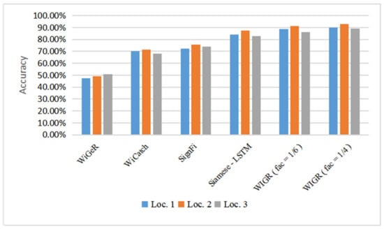 - Cross-location evaluation. For the location shift, we evaluated all the methods in the same environment to control variables, and then performed leave-one-location-out cross validation using CSI traces. As shown in Figure 9, our proposed WiGR model still shows excellent performance with an average recognition accuracy 90.8%, and, therefore, outperforms other methods. In addition, when the testing CSI data are collected at Loc. 1 and Loc. 3, the recognition performance is slightly reduced compared with the data collected at Loc. 2. This is because that the user performed gestures at Loc. 1 or Loc. 3 is very close to Rx or Tx. In this case, the user’s body will block more signals, resulting in weaker signal propagation, which in turn affects gesture recognition performance.