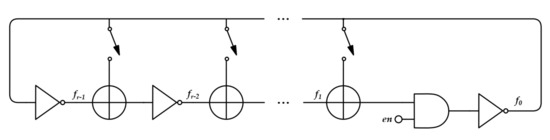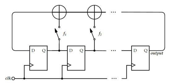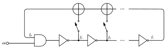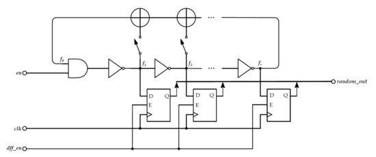 - Demir, K.; Ergün, S. A Comparative Study on Fibonacci-Galois Ring Oscillators for Random Number Generation. In Proceedings of the 2020 IEEE 63rd International Midwest Symposium on Circuits and Systems (MWSCAS), Springfield, IL, USA, 9–12 August 2020; pp. 631–634. [Google Scholar]