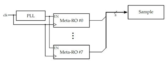 - Vasyltsov, I.; Hambardzumyan, E.; Kim, Y.S.; Karpinskyy, B. Fast digital TRNG based on metastable ring oscillator. In International Workshop on Cryptographic Hardware and Embedded Systems; Springer: Berlin/Heidelberg, Germany, 2008; pp. 164–180. [Google Scholar]