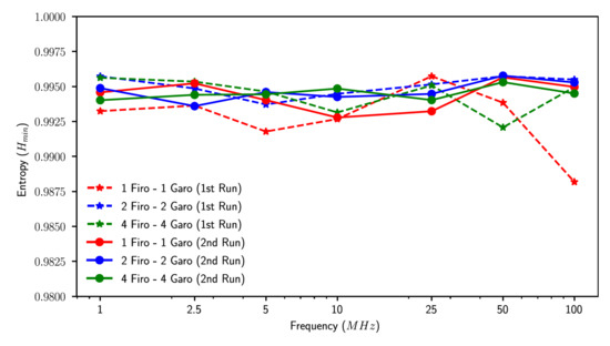 - The second one regards how the output quality depended on the sampling frequency. Until this point sampling took place at 1 MHz but deriving a plot of entropy as a function of frequency may have allowed us to make a trade-off between entropy source throughput and output quality.