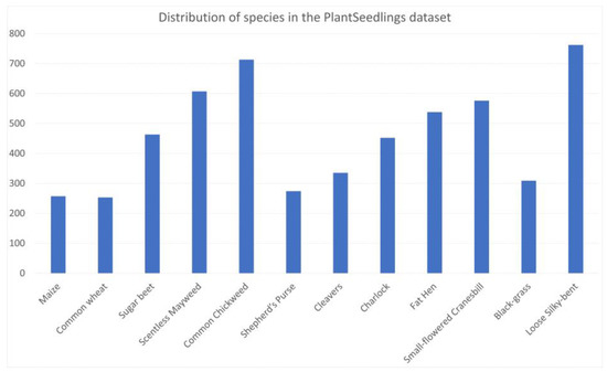 The PlantSeedlings dataset [36] contains images of plant seedlings placed on Styrofoam boxes. This dataset contains 5539 images of 12 species. Examining the distribution of species in this dataset (shown in Figure 1) shows that the dataset is imbalanced. Common Chickweed is the species with the largest number of images (713 images), while common wheat has the fewest images (253 images). Figure 2 shows examples of samples of all 12 species.