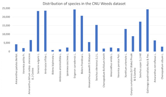 This dataset contains 208,477 images of 21 species produced by CNU, Gwangju, Republic of Korea. Images of weeds were captured and collected by Korean plant taxonomists working on farms and fields in the Republic of Korea with high-definition resolution cameras. Figure 5 shows example images from the CNU Weeds dataset, and Figure 6 shows the distribution of species in this dataset. This dataset is imbalanced. The species with the largest number of images is Galinsoga quadriradiata Ruiz & Pav. (24,396 images), while the species with the smallest number of images is Bidens bipinnata L. (804 images).
