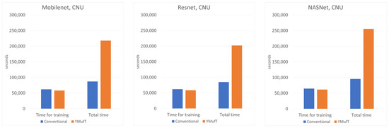 In Figure 16, minority classes showed a slight improvement in precision and recall using Mobilenet trained by the YMufT strategy. This improvement led to an increase in F1 score in those classes. In contrast, YMufT showed inappreciable improvement on minority classes in terms of precision and recall, making the F1 score lower than that of the conventional training method.