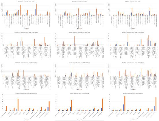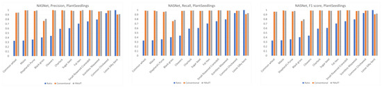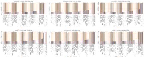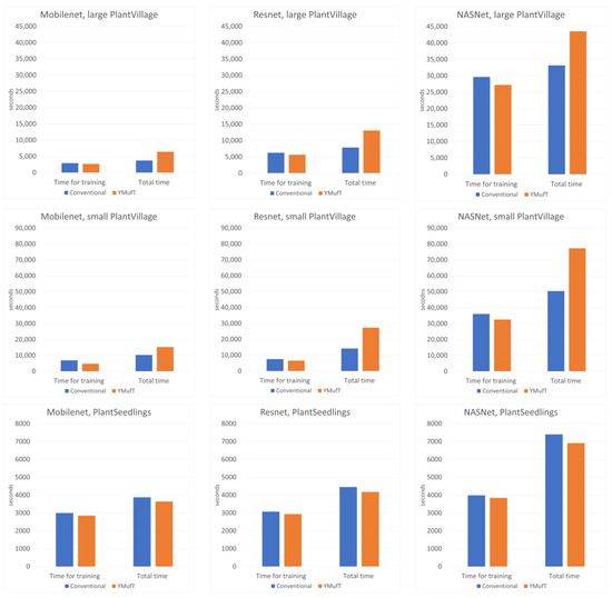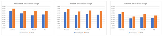 The learning curves in Figure 20 show that both the YMufT and conventional training strategies helped the models converge quickly. In contrast, the validation curves of models trained using YMufT converged at the first few validation times, except that NASNet suffered from overfitting before the 30th validation, then quickly converged later. Like on the small PlantVillage dataset, in Figure 21, YMufT was better than the conventional training method in terms of accuracy, precision, recall, and F1 score. In Figure 22, in most cases, use of YMufT served to increase precision, recall, and F1 score in both minority and majority species.