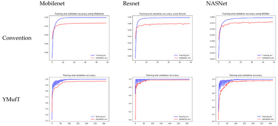 We applied transfer learning, and used parameters trained on the ImageNet dataset as the initial parameters to train the model. We fine-tuned all three models by adding a fully connected layer of length 256, batch normalization, ReLU, and a Softmax layer. The input RGB image for the three models was , normalized to the range . Stochastic Gradient Descent was used as the optimization method with a learning rate of 0.001. We applied these model configurations on both strategies to enable a fair comparison between the conventional and YMufT strategies, except that the batch size varied depending on the model and dataset. Table 1 show the batch sizes for each model and dataset, which were applied for both training approaches.