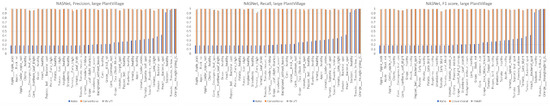Precision, recall, and F1 score on each class in the large PlantVillage dataset. The blue bars indicate the ratio of the number of samples of a class to the maximum number of samples in all classes.