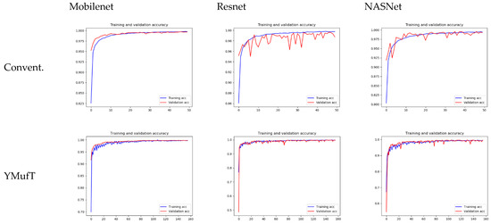 As with the CNU Weeds dataset, the model converged on the first few validations faster than YMufT, which needed 60 validations to converge. Figure 15 shows the outstanding overall performance of YMufT in Mobilenet. Training Mobilenet in this dataset using the YMufT strategy resulted in an overall performance that was superior to those of Resnet and NASNet. The learning curves of the two latter models show more oscillation, illustrating the difficulty in generalizing sample characteristics in this dataset.