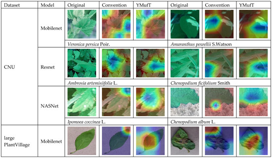 To further explore the effectiveness of YMufT, we applied Grad-CAM [41] to visualize the behavior of the models trained by the conventional method and YMufT strategy. Figure 24 shows examples of images that were incorrectly predicted by the models trained with the conventional method but correctly classified by those trained using YMufT. On the CNU Weeds dataset, YMufT helped the models focus on the leaf surface, while conventional training was more focused on high-level features. Specifically, for the species Veronica persica Poir. and Amaranthus powellii S.Watson, conventional training focused on the lower curve position, while YMufT concentrated on leaf veins and leaf blades. A similar phenomenon also occurred on Ambrosia artemisiifolia L., Ipomoea coccinea L., and Chenopodium album L. species. The only image from Chenopodium ficifolium Smith contains overlapping leaves, so the YMufT strategy guided the model to localized areas around leaf centroids, while the conventional training method focused on a lower region. Similar things happened on the large PlantVillage dataset, such as for images of Cherry___healthy, Tomato___Late_blight, Tomato___Bacterial_spot, Apple___Apple_scab, and Potato___Early_blight. For one image of Pepper,_bell___Bacterial_spot, both methods focused on the leaf surface, but the YMufT strategy mainly concentrated on the petiole region. Generally, on large datasets, YMufT helped the model focus on the leaf surface to capture essential low-level features. In contrast, the conventional training method focused on high-level features such as leaf curves, which may not be significant in terms of species characteristics.